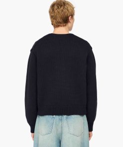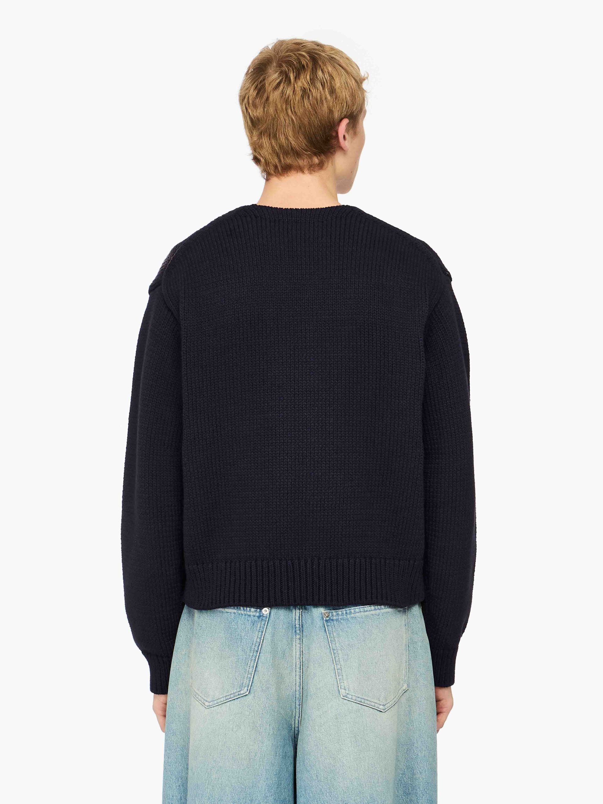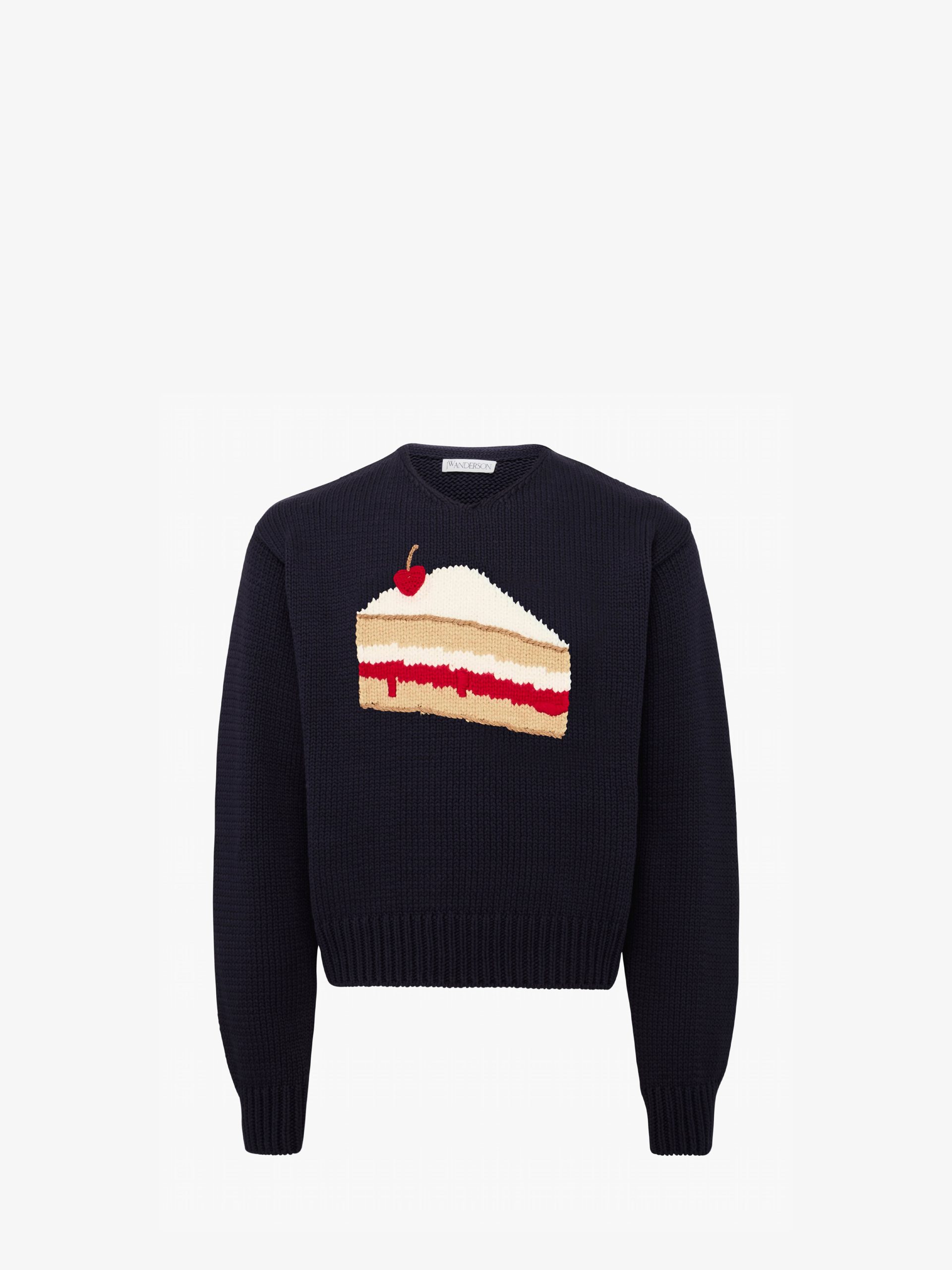 Knitted sweater with shrunken silhouette, complete with intarsia "Victoria Sponge" motif High V-neckline Dropped shoulder Black logo plaque on centre back Ribbed cuffs and hem For a more oversized fit, take a larger size
