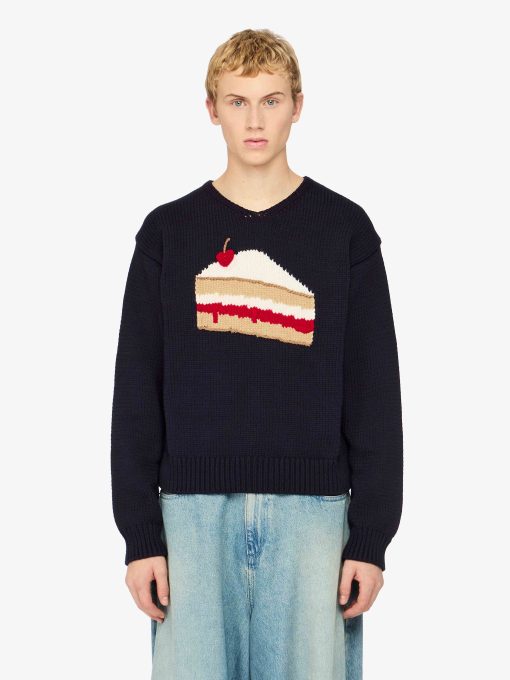 Knitted sweater with shrunken silhouette, complete with intarsia "Victoria Sponge" motif High V-neckline Dropped shoulder Black logo plaque on centre back Ribbed cuffs and hem For a more oversized fit, take a larger size