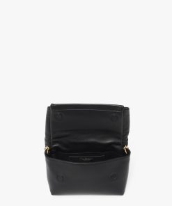 Soft twisted top handle bag with detachable crossbody gold chain Blind logo embossing on front flap Magnetic flap opening Inner pocket with gold logo embossing Nappa lining Can be worn as a clutch, on the shoulder or as a crossbody